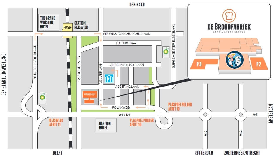 From the direction of Rotterdam, take the A13 towards The Hague. At the Ypenburg junction, follow the direction Rijswijk A4 (exit 7-Rijswijk). Follow the A4 until the Plaspoelpolder exit (exit 10). At the end of the exit, turn right onto “Diepenhorstlaan”. At the 1st traffic lights, turn left onto “Visseringlaan”. After 250 meters turn left onto “Volmerlaan” and after 50 meters you will see De Broodfabriek on your right.
