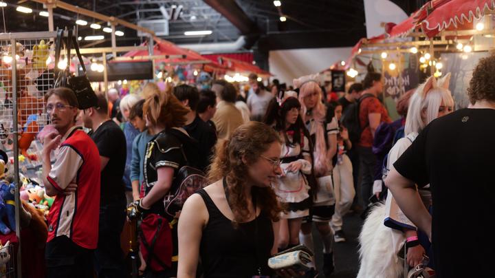 The usual rules apply (orange zone). Eating and drinking are not allowed, also please leave over-sized cosplay props outside of the Dealer Room.